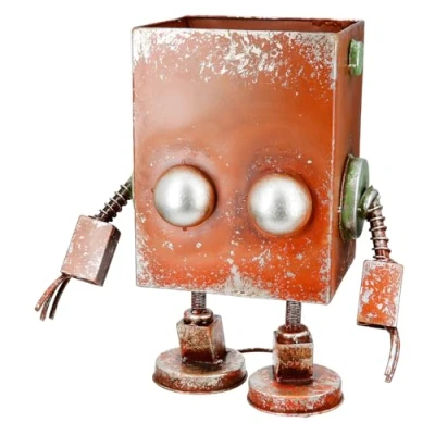 UNIQUE DESIGN The robot shape planter with spiral legs adds a futuristic touch to any room and is a real eye-catcher. HIGH QUALITY MATERIAL Made of durable metal, the planter provides durability and stability for your plants. STYLISH COLORWAY The rust brown color with silver and green accents perfectly matches modern and classic home styles. ANTIQUE FINISH - The matte antique finish provides an elegant look and blends harmoniously into any environment. COMPACT DIMENSIONS With a height of 37.5 cm, width of 34 cm and depth of 19 cm, ideal for smaller plants and limited space.