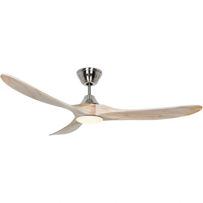 General description The DC Ceiling Fan Eco Genuino combines a sleek brushed chrome housing with natural wood blades, offering both style and functionality. It features integral LED lighting and a remote control for convenient operation. Technical specifications Voltage: 220-240 V ~ 50 Hz Diameter: 152 cm / 60" Housing colour: brushed chrome Blade colour: natural wood Integral lighting: 17 W LED (included) Motor wattage: 3.3 / 3.6 / 4.8 / 6.6 / 9.4 / 16.5 W Revolutions per minute: 50 / 57 / 77 / 96 / 114 / 144 Max. airflow rate: 152.9 m³/min / 5399 cfm Max. sound pressure level Lp-3m: 20.1 dB(A) Max. sound power level: 40.6 dB(A) Ceiling to blades: 34 cm / 13.4" Ceiling to bottom: 42 cm / 16.5" Diameter canopy: 18 cm / 7.1" Max. ceiling slope: 18° Average service life of LED: 20000 h Colour temperature: 3000 K CRI: 80 Angle of radiation: 120° Dimmable: Yes Compatibility and accessories Includes remote control 6 fan speeds / off Light on / off / dimming Running direction: forward and
