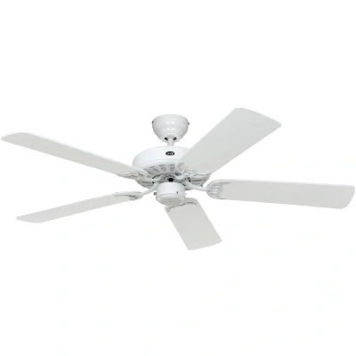 General description The Classic Royal White Ceiling Fan combines elegance and functionality, featuring a sleek white design with reversible blades in white and light grey. This fan is perfect for enhancing the comfort of your living space while adding a touch of classic style. Technical specifications Voltage: 220-240 V ~ 50 Hz Diameter: 132 cm / 52" Housing colour: white Blade colour: white / light grey (reversible) Motor wattage: 27.2 / 46.1 / 64 W Revolutions per minute: 99 / 164 / 180 Max. airflow rate: 148.7 m³/min / 5251 cfm Max. sound pressure level Lp-3m: 30.9 dB(A) Max. sound power level Lw: 47.7 dB(A) Ceiling to blades: 28 cm / 11" (20 cm / 7.9" without rod) Overall drop: 30 cm / 11.8" (23 cm / 8.7" without rod) Diameter canopy: 13 cm / 5.1" Max. ceiling slope: 28° Weight: 6.9 kg / 15.2 lbs Other information Manual reversing switch for summer and winter mode on the housing Includes pull switch: 3 fan speeds / off
