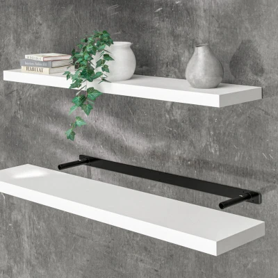 ManoManoGeneral description The CASARIA® Floating Shelves are a high-quality wall shelf designed to add an elegant touch to any room in your home. With a modern design and a free-floating effect, these shelves appear to float on the wall, making them a stylish choice for showcasing your favorite items. They are perfect for use in various spaces, including the living room, bedroom, kitchen, bathroom, children's room, office, and hallway. Technical specifications Material: MDF (E1 standard) Thickness: 3.8 cm Load capacity: 15 kg Available sizes: 50 x 23 x 3.8 cm 70 x 23 x 3.8 cm 90 x 23 x 3.8 cm 110 x 23 x 3.8 cm Wall bracket dimensions: 30/40/40/65 x 14 x 2.7 cm Weight: 1.5 kg (50 cm), 2 kg (70 cm), 2.6 kg (90 cm), 3 kg (110 cm) Available colors: High-gloss white, high-gloss black, high-gloss grey, grey, white, black, grey oak, dark oak Installation Installation is quick and easy, allowing for both horizontal and vertical mounting. The wall bracket provided is designed to be hidden within the