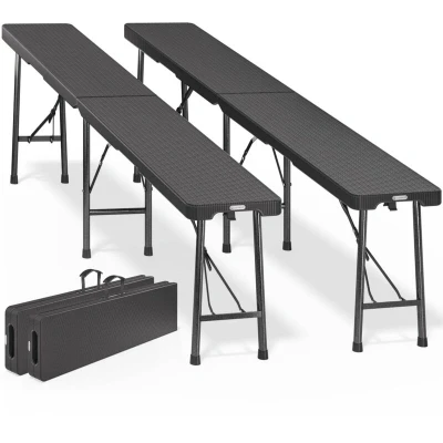 CASARIA® 2x 183cm Folding Beer Benches For Up To 8 People Polyrattan Look Plastic Foldable Camping Bench Set Carry Handle Outdoor Garden Dining BBQ Party Picnic Patio Furniture Black