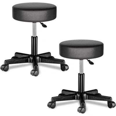 CASARIA 2x 35cm Black Rolling Stools with Wheels Height Adjustable 360 Rotatable Padded Swivel Chair Double Castors Roll Stool Comfortable Upholstered Seating Office Workshop Salon