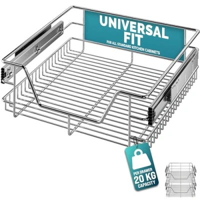 ORGANISATION: The 2 Piece telescopic drawer set from Casaria allows you to organise your kitchen additionally, giving you more space and storage space. So enjoy your new and clear kitchen organisation! VERSATILE: The kitchen drawers are perfect for storing dishes, spices, fruits and vegetables. Thanks to the metal rods, you always have everything in view. A little hint! You can also use the storage baskets optimally for your wardrobe or hobby room. 20KG LOAD CAPACITY: so that you can store your things without worry, the drawers can each hold up to 20kg and are therefore particularly stable and robust. The basket pull-outs are made of chrome-plated metal with galvanised guide rails. For direct installation, 6 screws are included in the pack. EXTENDABLE: With the pull-out drawers you can now bring more structure into your home. The telescopic drawers can be completely pulled out, giving them a total length of 83 cm. COMPATIBLE: The lattice drawers, for units with a width of 50 cm, can be used for all common cabinet widths and subsequently installed or retrofitted as required. Therefore, you are very flexible with your new organisation system and can design everything according to your wishes. We offer the drawers for various, common cabinet widths. Product Advantages: - Including 6 screws for a perfect secure hold. All screws in silver. They´ll match any kitchen decoration. #NAME? - 6 screws or a perfect stand