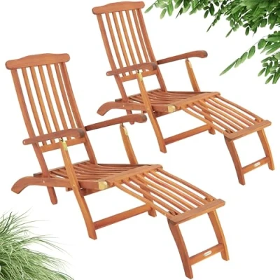 ManoManoGeneral description Chill in style with the Queen Acacia Wood Sun Lounger from CASARIA. Experience ultimate relaxation with this set of 2 foldable sun loungers, crafted from FSC-certified acacia wood. They feature comfortable footrests and adjustable backrests for luxurious lounging. The foot segment of the loungers is detachable, allowing you to conveniently transform them into sun chairs, providing versatile comfort tailored to your preference. Technical specifications Crafted from FSC-certified acacia wood Weight capacity: 160kg Chair Dimensions (LxWxH): 120 x 54 x 95 cm Dimensions with Footrest (LxWxH): 169 x 54 x 95 cm Other information Decorative wooden struts add an elegant touch Stylish, rounded armrests for added comfort Conveniently foldable for space-saving storage Appealing design that complements any outdoor setting What's Included: 2 Sun Lounger Deckchairs
