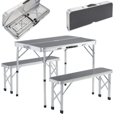 General description On the go with CASARIA - always well equipped! The CASARIA folding table set, which includes 2 benches, is the perfect companion for your next camping holiday or festival visit. It is also ideal for use in the garden or indoors. This multifunctional camping table set offers space for up to 4 people and is designed to take up minimal space. With a table size of 90x60cm, it provides a cozy setting for dining, games, or buffets, and is weatherproof, making it suitable for various outdoor activities. Technical specifications Table dimensions (LxWxH): 90x60x70cm Table dimensions when folded (LxWxH): 90x10x34cm Load capacity table: up to 30kg Dimensions bench (LxWxH): 87x25x40cm Load capacity per bench: 80kg Material: Aluminium and MDF Ø umbrella holder: up to 4.5cm Total weight: 7.7kg Choice of colours: White or Gray Compatibility and accessories Includes 1 x Aluminum folding camping table Includes 2 x Benches Installation No assembly necessary Usage Perfect for dining,