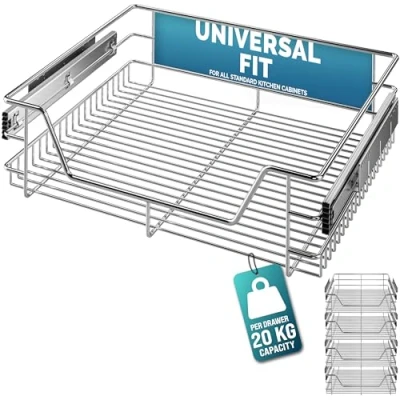 ORGANISATION: The 4-piece telescopic drawer set from Casaria allows you to organise your kitchen additionally, giving you more space and storage space. So enjoy your new and clear kitchen organisation! VERSATILE: The kitchen drawers are perfect for storing dishes, spices, fruits and vegetables. Thanks to the metal rods, you always have everything in view. A little hint! You can also use the storage baskets optimally for your wardrobe or hobby room. 20KG LOAD CAPACITY: so that you can store your things without worry, the drawers can each hold up to 20kg and are therefore particularly stable and robust. The basket pull-outs are made of chrome-plated metal with galvanised guide rails. For direct installation, 6 screws are included in the pack. EXTENDABLE: With the pull-out drawers you can now bring more structure into your home. The telescopic drawers can be completely pulled out, giving them a total length of 83 cm. COMPATIBLE: The lattice drawers, for units with a width of 60 cm, can be used for all common cabinet widths and subsequently installed or retrofitted as required. Therefore, you are very flexible with your new organisation system and can design everything according to your wishes. #NAME? - Greater clarity and organisation in your cupboards - 6 screws for optimised hold #NAME? #NAME?