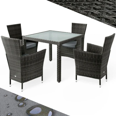 General description The CASARIA® 5-Piece Poly Rattan Garden Furniture Set is perfect for enjoying summer evenings and BBQ parties in your garden, on your patio, or on your balcony. This stylish set includes a 90x90cm table and four comfortable garden chairs, inviting you to relax and unwind. Technical specifications Table Dimensions (LxWxH): 90x90x75cm Chair Dimensions (LxWxH): 59x59x88cm Table Top Material: 5mm thick safety glass Frame Material: Powder-coated steel Weave Material: Poly-rattan Seat Height (without cushion): 43cm Cushion Thickness: 7cm Table Load Capacity: 80kg Chair Load Capacity: 160kg Cushion Material: 100% Polyester Colour Options: Cream/Cream; Grey/Anthracite Compatibility and accessories Package Includes: 1x Table with Milk Glass Top 4x Chairs 4x Cushions Installation Chairs are stackable for easy storage. Both table and chairs have height-adjustable feet for added stability on uneven surfaces. Usage Perfect for garden parties and BBQ evenings. Cushions are