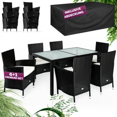 General description The CASARIA® 6+1 Polyrattan Garden Dining Furniture Set is designed for comfort and style in your outdoor area. This weather-resistant seating group includes a 150x90cm table and six comfortable garden chairs, perfect for enjoying summer evenings and barbecues in the garden, on the patio, or on the balcony. The set features soft, 7cm thick seat cushions that are washable at 30°C, ensuring a pleasant seating experience. Technical specifications Table dimensions (LxWxH): 150x90x75cm Chair dimensions (LxWxH): 59x59x88cm Cover dimensions: 242x162x100cm Table top material: 5mm thick frosted glass Wicker material: Polyrattan Frame material: Powder-coated steel Seat height without cushion: 43cm Thickness of seat cushion: 7cm Load capacity: Table 80kg / Chair 160kg Material upholstery: 100% Polyester Compatibility and accessories Includes 1x table with frosted glass top Includes 6x chairs with cushions Includes 1x weather-resistant tarpaulin cover Other information High