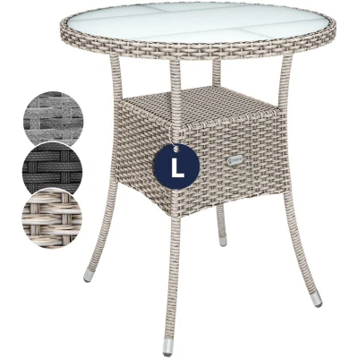 General description The CASARIA® Coffee Table is a stylish and functional addition to your outdoor space. Made from high-quality polyrattan, this balcony table features an elegant frosted glass top available in two sizes (60cm or 80cm in diameter), providing ample space for drinks, flowers, or magazines. An additional shelf beneath the tabletop offers extra storage, making it perfect for any garden, balcony, or terrace setting. Technical specifications Size model L (Ø x H): 60 x 74 cm Size model XL (Ø x H): 80 x 74 cm Frosted glass thickness: 5 mm Load capacity of tabletop: 80 kg Load capacity of lower shelf: 20 kg Weave material: polyrattan Frame material: powder-coated steel Colour options: Grey, Black, Beige Installation The table can be assembled in just a few steps. Usage Suitable for both indoor and outdoor use. Easy to clean and maintain. Water-repellent design. Other information Height-adjustable aluminium feet for optimal stability. Weatherproof and UV-resistant materials