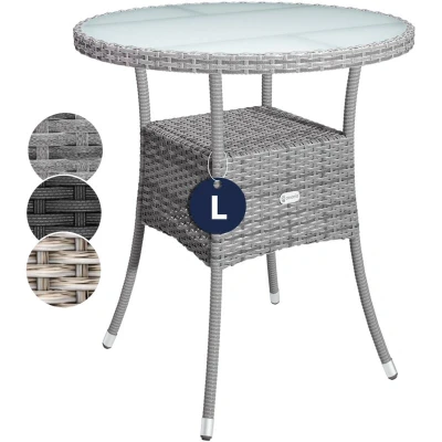 General description The CASARIA® Coffee Table is a stylish and compact garden table made from high-quality polyrattan, designed to enhance your outdoor space. It features an elegant frosted glass tabletop available in two sizes (60cm or 80cm in diameter), providing ample space for drinks, flowers, or magazines. An additional shelf beneath the tabletop offers extra storage, making it both functional and aesthetically pleasing. The table's modern design allows it to seamlessly blend with other garden furniture, whether on the balcony, in the garden, or on the terrace. Technical specifications Size model L (Ø x H): 60 x 74 cm Size model XL (Ø x H): 80 x 74 cm Frosted glass thickness: 5 mm Load capacity of tabletop: 80 kg Load capacity of lower shelf: 20 kg Weave material: polyrattan Frame material: powder-coated steel Colour options: Grey, Black, Beige Installation The table can be assembled in just a few steps. Assembly instructions and material are included. Usage Suitable for both