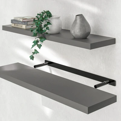 General description The CASARIA® Floating Shelves are high-quality wall shelves designed with a modern aesthetic, making them an elegant addition to any room in your home. The shelves feature a free-floating effect, as the wall bracket is concealed within the shelf, creating the illusion that the shelf is floating on the wall. They are perfect for displaying your favorite items and can enhance the ambiance of various spaces including the living room, bedroom, kitchen, bathroom, children's room, office, and hallway. Technical specifications Material: MDF (E1 standard) Thickness: 3.8 cm Load capacity: 15 kg Available sizes: 50 x 23 x 3.8 cm 70 x 23 x 3.8 cm 90 x 23 x 3.8 cm 110 x 23 x 3.8 cm Wall bracket dimensions: 30/40/40/65 x 14 x 2.7 cm Weight: 1.5 kg (50 cm), 2 kg (70 cm), 2.6 kg (90 cm), 3 kg (110 cm) Available colors: High-gloss white, High-gloss black, High-gloss grey, Grey, White, Black, Grey Oak, Dark oak Installation Installation is quick and easy, allowing for both