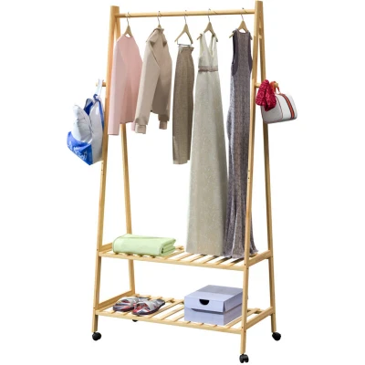 General description Practical clothes rack with bamboo castors, featuring high quality and a timeless design. This space-saving coat stand takes up minimal space while offering ample storage for your favorite items, keeping them easily accessible. It includes a clothes rail, 4 coat hooks, and two shoe racks, providing plenty of organization options. Technical specifications Dimensions (HxWxD): 155x70x45cm Load capacity: up to 50kg Load capacity per shoe rack: up to 10kg Distance between the shelves: 31.8cm Material: Bamboo Other information Includes 4 castors (2 lockable) for easy mobility Coated with a clear varnish, suitable for slightly moist environments Assembly instructions and assembly material included