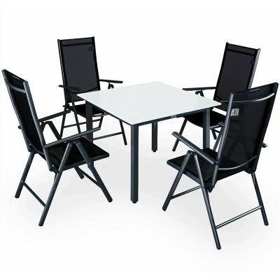 General description This 5-piece aluminum seating group from CASARIA® features a stylish design with adjustable high-back chairs, making it an ideal choice for outdoor furniture. The set includes a 90x90cm table and four folding chairs, providing comfort and convenience for your garden or patio. Technical specifications Table dimensions (LxWxH): 90 x 90 x 75 cm Dimensions of high-back chair (DxWxH): 65 x 60 x 111 cm Table/chair frame material: Powder-coated aluminum with stainless steel screws Table top material: 5mm high-strength safety glass Cover material: Plastic fabric (70% polyvinyl chloride / 30% polyester) Load capacity: Chair - 120kg / Table - 75kg Colour of covers: Black Table top colour: Frosted Compatibility and accessories Package contents: 1x Table 1x Glass plate 4x Folding chairs 1x Assembly instructions and assembly material Installation Assembly instructions included for easy setup. Usage Perfect for outdoor dining and relaxation. Chairs are foldable for space-saving