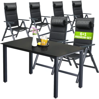 General description The CASARIA® Bern 7 Piece Aluminium Garden Furniture Set is a high-quality outdoor seating group designed for comfort and durability. It includes a spacious 150x90cm table and six adjustable high back reclining chairs, each equipped with head cushions for added support. Technical specifications Table dimensions (LxWxH): 150x90x75cm High backrest dimensions (DxWxH): 69x57.5x112.5cm Backrest dimensions (LxW): 46x69cm Head cushion dimensions (WxHxD): 33x16x6cm Seat height: 44cm Armrest height: 63cm Material frame: powder-coated aluminium Table top material: 5mm safety glass Cover material: 70% polyvinyl chloride / 30% polyester Load capacity: chair 120kg / table 75kg Compatibility and accessories Included in delivery: 1x table with glass top 6x folding chairs 1x assembly instructions and assembly material Usage The CASARIA® Bern set is perfect for outdoor patios, gardens, or balconies, providing a comfortable and stylish seating option for gatherings and relaxation.