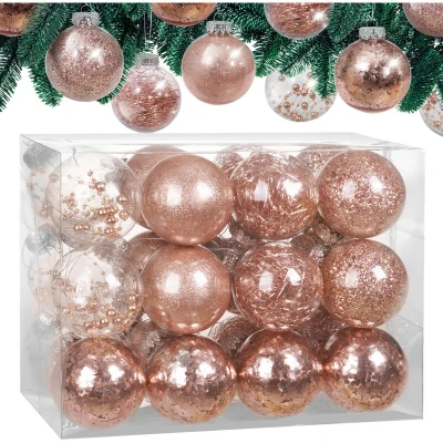 General description Create your Christmas tree masterpiece with the CASARIA® Christmas Baubles 24-Piece Set. These delightful ornaments feature a variety of imaginative designs, including round, hexagonal, glitter-infused styles, ball chains, and tinsel fillings, allowing you to craft a unique holiday decoration. Made from shatterproof synthetic material, these robust baubles are perfect for homes with kids or pets, ensuring they remain unharmed even if they take a tumble. Their reflective surfaces come to life when exposed to light, creating a mesmerizing 3D effect that enhances your festive décor. Technical specifications Material: 100% synthetic material Diameter: Available in 6cm, 7cm, and 8cm Colours: Champagne, Gold, Pink, Rose-Gold, and Red Material suspension: 100% metal Other information Includes 1x Set of 24 Christmas tree baubles with fillings and hangers