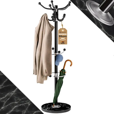 General description The CASARIA® Elegant Coat Rack combines style and functionality, making it an ideal clothing organizer for hallways, foyers, and offices. With its compact design, it optimally utilizes space while offering ample storage for jackets, coats, and hats. The coat rack features 14 hooks arranged on three levels, including a convenient umbrella stand. Technical specifications Size (LxWxH): 37 x 37 x 175 cm Material: metal, plastic, marble Number of hooks: 14 Width of head: 46 cm Diameter of base: 37 cm Height of base: 2.4 cm Maximum load capacity: 35 kg Available colors: White, Black Installation Easy assembly with included mounting material Assembly instructions provided Usage 14 hooks for hanging jackets, coats, hats, handbags, and backpacks Upper 5-arm wreath with 10 hooks rotates 360° for easy access Middle section features 4 hooks with knobs, accessible for children