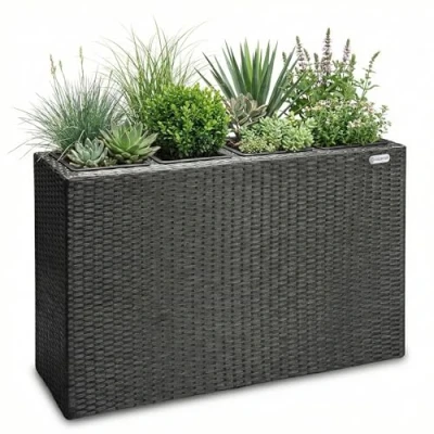 ManoManoGENERAL DESCRIPTION Spring is on its way! Embrace the changing seasons with the CASARIA® planters, perfect for enhancing your garden, balcony, apartment, or conservatory. These stylish flower pots, made from hand-woven poly rattan, serve as beautiful focal points wherever they are placed. Durable and versatile, these planters can be used both indoors and outdoors. Poly-rattan, a strong plastic fiber designed for outdoor furniture, forms the sturdy structure of these planters. They are resistant to weather, UV light, and dirt, making them easy to maintain. The inner pots are removable from the poly rattan frame, simplifying planting and maintenance. For outdoor use, drilling a hole in the base allows for proper drainage and prevents waterlogging. These planters can also serve as privacy screens or room dividers. TECHNICAL SPECIFICATIONS Frame Material: Powder-coated steel Weave Material: Poly rattan Inner Pot Material: Plastic Planter Dimensions (LxWxH): 95x27x60 cm Inner Pot