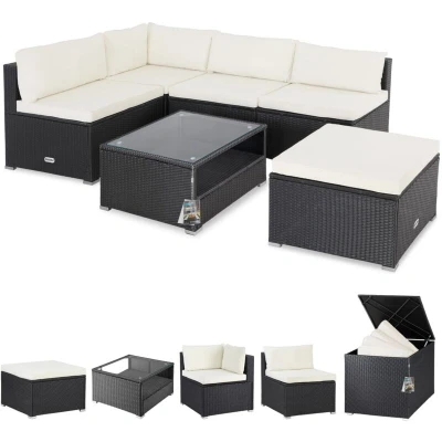 XL Premium Polyrattan Lounge Set from CASARIA® The 16-piece seating set offers numerous combination options and can be customised. A special highlight is the protected shelf under the removable table top , which is equipped with a 5mm thick safety glass plate that is secured against slipping by suction cups. The 7 cm thick seat cushions and 15 cm thick back cushions ensure a high level of seating comfort. With a seat height of 47 cm, the seats offer additional comfort. The covers are removable with a concealed zip and washable at 30°C . To prevent scratches, the robust feet are fitted with plastic protectors. The individual elements can be connected with 6 connecting clips. The 318 litre capacity cushion box offers plenty of storage space for cushions and garden accessories. The weatherproof polyrattan is dirt-repellent, UV-resistant and easy to clean. Product advantages: Lounge: Storage space under the table top Can be flexibly combined Extra thick cushions Table with 5 mm safety