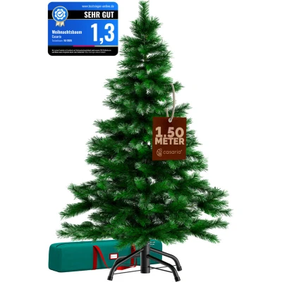 General description Fresh from Santa's tree nursery, the CASARIA® artificial Christmas trees are designed to bring the festive spirit into your home. Perfect for any setting, whether in your living room, shop window, or patio, these trees are crafted with care and can be decorated to your liking. Available in various sizes and styles, they feature branches made from PVC, injection moulding, or a combination of both. These trees are needle-free, fireproof, and come with a sturdy metal stand, allowing you to create a glamorous holiday atmosphere effortlessly. Technical specifications Standard 150cm: green - 310 tips - material PVC Standard 180cm: green - 533 tips - material PVC Standard 240cm: green - 1057 tips - material PVC Mix 140cm: dark green - 470 tips (337 PVC tips and 133 injection moulded tips) - material PVC and PE White 150cm: white - 350 tips - material PVC White 180cm: white - 533 tips - material PVC Snow 180cm: green/white - 705 tips (includes pine cones & snow decor)