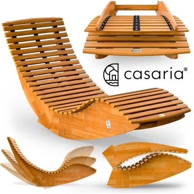 General description Experience relaxation like never before with the CASARIA® JAVA Rocking Wooden Garden Lounger. Crafted from high-quality FSC®-certified acacia wood, this weatherproof lounger is designed for both indoor and outdoor use. Its ergonomic shape conforms to your body, providing a gentle rocking motion that enhances your relaxation experience. The lounger features a rocking stop and can be easily folded for convenient storage. Technical specifications Material: FSC®-certified acacia wood Dimensions (LxWxH): 155x60x93 cm Load capacity: up to 160 kg Treated with high-quality linseed oil on a biological basis No chemical wood preservatives Colour: Brown Installation Simple assembly with pre-assembled slatted frame Assembly material included Usage Suitable for indoor and outdoor use Easy to clean with a damp cloth To maintain color and durability, use a special oil for garden furniture Other information Included in delivery: 1 x folding swing lounger, wood care instructions