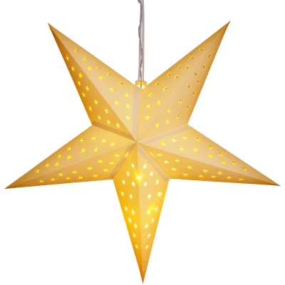 General description Make eyes sparkle at Christmas time! The 60 cm tall, foldable poinsettias from Casaria create a beautiful and enchanting ambience during the festive season. With 10 warm white LEDs, these battery-operated LED paper stars can be hung anywhere, such as in a window or on a door, as they do not require a power socket. These decorative stars reveal their full splendour when illuminated, but they are also visually appealing when unlit. The battery compartment is cleverly hidden from view by the extra-long cable, and the Advent stars can be folded up for space-saving storage. Technical specifications Diameter: 60 cm Material: Paper Light source: 10 x Warm White LEDs Required batteries: 2 x AA (not included) Compatibility and accessories Models available: - Model 1: Paper Star Red, dots, 7 points - Model 2: Paper Star White, stars, 5 points - Model 3: Paper Star White, dots, 7 points - Model 4: Paper Star White, dots, 5 points Usage Can be hung in various locations such as