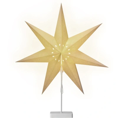 General description Starry moments for your home! The CASARIA® LED Star Lamp with Stand creates a festive atmosphere with its 10 warm white LEDs, perfect for Christmas, Advent, or winter celebrations. This battery-operated star can be placed anywhere, such as on a windowsill, table, or fireplace, and features a foldable design for easy storage when not in use. Available in two models: one with sequins and another with small stars, it adds a cozy Nordic hygge vibe to any space. Technical specifications Diameter: 60 cm Material: Paper Light source: 10 x Warm White LEDs Required batteries: 3 x AA (not included) Other information The patterned holes on this seven-point star create a gorgeous twinkling effect. The battery compartment can be hidden for a sleek appearance, eliminating unsightly power cables. Stands easily on any level surface and is perfect for those who appreciate an organized home.