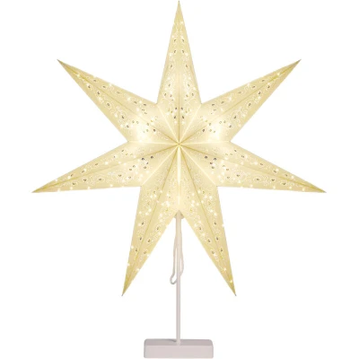 General description Starry moments for your home! The CASARIA® LED Star Lamp with Stand is illuminated with 10 warm white LEDs, creating a festive atmosphere in no time. This battery-operated star can be placed anywhere, whether on the windowsill, table, or fireplace. It features a foldable design for easy storage when not in use, making it perfect for those who appreciate an organized home. The star's patterned holes produce a gorgeous twinkling effect, adding a cozy Nordic hygge vibe to any space. Technical specifications Diameter: 60 cm Material: Paper Light source: 10 x Warm White LEDs Required batteries: 3 x AA (not included) Other information Models available: Model 1 - Paper star with sequin cut outs, 7 points; Model 2 - Paper star with star cut outs, 7 points Foldable for space-saving storage Wireless operation with hidden battery compartment Stand included Perfect for creating a festive and Christmassy atmosphere