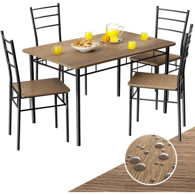 General description The CASARIA Leo dining set consists of a dining table and four chairs, transforming your dining room into a stylish gathering place. The frame, made of black powder-coated metal in a chic industrial design, gives the dining group a modern touch. This breakfast set is available in three different wood decors: light oak, beech, or modern anthracite, seamlessly complementing any interior. The table group is not only beautiful but also highly durable, featuring rounded edges for an aesthetic touch and additional safety. Wipeable surfaces made of MDF wood fibre and floor protectors on table and chair legs make the Leo dining set easy to care for and practical. Thanks to its compact dimensions, the chairs can be conveniently stored under the table, requiring minimal space in the kitchen or dining room when not in use. Technical specifications Seat and tabletop material: 15mm MDF wood fibre board Frame material: Powder-coated metal Table dimensions (LxWxH): 110x68x74.5cm