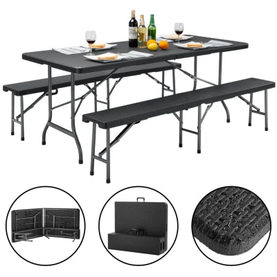 CASARIA® Malmö 3Pc Garden Trestle Table & Bench Set 180cm Foldable Outdoor Furniture Plastic Top w/Steel Frame Polyrattan Finish Picnics BBQ Parties Portable Lightweight Black