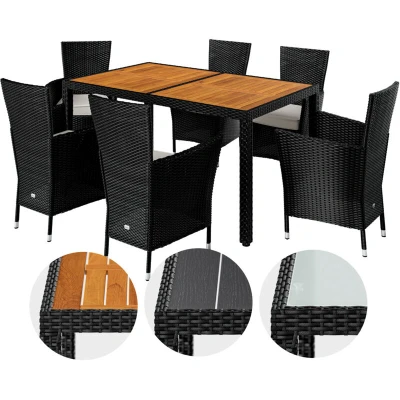 General description Comfortable garden furniture for 6 people, the CASARIA® seating group is made of weather-resistant, hand-woven polyrattan. It includes a rectangular table measuring 150x90x75 cm and 6 garden chairs, providing ample space for summer gatherings in the garden, on the terrace, or on the balcony. The set features curved armrests, wide backrests, and 7 cm thick seat cushions for optimal seating comfort. The chairs can each hold up to 160 kg and are stackable for space-saving storage. The acacia wood table top adds a modern, warm look that complements any garden oasis. Technical specifications Table dimensions (LxWxH): 150x90x75 cm Chair dimensions (LxWxH): 58x60x88 cm Seat height without cushion: 43 cm Table top thickness: 5 mm Weave material: polyrattan Frame material: powder-coated steel Table top material: acacia wood Cushion material: 100% polyester Weave color: black Cushion color: cream Table load capacity: 80 kg Chair load capacity: 160 kg Scope of delivery 1 x