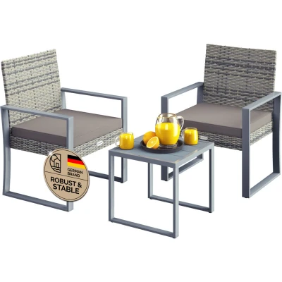 CASARIA® Polyrattan 3pc Garden Furniture Lounge Set Weatherproof Patio Table 2x Chairs WPC Top 160kg Load Capacity 2 Cushions Height Adjustable Feet Grey