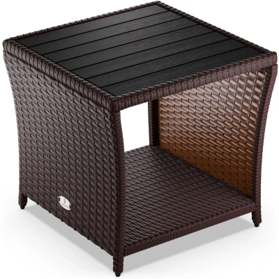 General description The CASARIA® Polyrattan Garden Side Table is a stylish and practical addition to your home, perfect for both indoor and outdoor use. Its versatile design allows it to serve as a side table, footrest, or plant stand, making it a highlight in any setting. The durable WPC tabletop features a natural wood look, while the weatherproof polyrattan ensures it remains attractive and functional in various conditions. A convenient storage compartment under the table provides space for magazines, books, and other items. Technical specifications Dimensions: 45 x 45 x 40 cm Tabletop material: 100% WPC (Wood Plastic Composite) Maximum load capacity: 80 kg Tabletop thickness: 1.6 cm Available colors: Black, Grey, Cream, or Brown Other information Weatherproof, dirt-repellent, and UV light-resistant polyrattan Powder-coated steel frame for enhanced stability Easy to clean Assembly instructions included