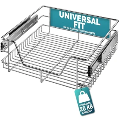 ManoManoGeneral description These versatile telescopic drawers are perfect for enhancing storage in your kitchen, bathroom, bedroom cupboard, or workshop. They allow you to quickly and easily create new storage options by retrofitting existing cupboards, providing greater clarity and organization. Technical specifications Material: chrome-plated metal Max. load capacity: 20kg Height: 14 cm Length: 44 cm Extended Length: 83 cm Available for cupboard widths: 30 cm, 40 cm, 50 cm, 60 cm Internal cupboard width and basket width: 30 cm Door - 26/27 cm Internal Cupboard Width - Basket Width 19 cm 40 cm Door - 36/37 cm Internal Cupboard Width - Basket Width 29 cm 50 cm Door - 46/47 cm Internal Cupboard Width - Basket Width 39 cm 60 cm Door - 56/57 cm Internal Cupboard Width - Basket Width 49 cm Installation Simple assembly with included screws 6 screws provided for optimized hold Suitable for standard cabinet widths of 30cm, 40cm, 50cm, and 60cm (external dimensions) Usage Ideal for retrofitting in