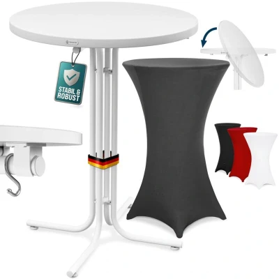 ManoManoGeneral description The CASARIA® Round Bar Table with Slip Cover is an elegant and versatile addition to any celebration, whether it's a festive champagne reception, a garden party, or a romantic wedding. Standing at 110 cm high with a 70 cm diameter table top, this foldable bar table is designed for both indoor and outdoor use, making it perfect for private parties and events. Technical specifications Table height: 110 cm Table top diameter: 70 cm Table top thickness: 1.8 cm Material of table legs: powder-coated metal Table top material: MDF with PVC coating Cover material: 90% polyester, 10% elastane Max. load: 100 kg Table colour: White Cover colour options: White, Red, Grey, Black Compatibility and accessories Includes 1x bar table and cover of your choice Installation Easy to assemble and foldable for space-saving storage Usage Suitable for indoor and outdoor events Easy to clean; cover is washable at 30° C Features 2 hooks for hanging bags or jackets