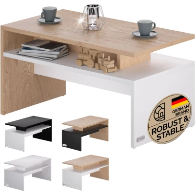 General description The CASARIA® Sacramento coffee table combines modern design with practical storage solutions. Its linear design not only enhances your living space but also provides easy access to essentials like remote controls, magazines, and snacks, thanks to its second shelf that is accessible from three sides. This table adapts well to various sofa shapes and offers generous storage while maintaining an open and airy feel. Technical specifications Dimensions (LxWxH): 95x55x50 cm Material: 15 mm chipboard Load capacity: 50 kg 4 plastic feet Other information Scratch-resistant melamine resin coating Water-repellent and easy to clean surface Available in multiple color combinations: pure white, white/sonoma oak, white/anthracite, and wood/grey Includes assembly material and instructions