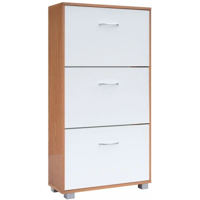 General description This CASARIA® Shoe Storage Cabinet Rack is a timeless and modern solution for organizing your shoes, toys, clothes, and books. With its elegant design and space-saving dimensions, it is perfect for narrow hallways. The cabinet features three spacious flaps that provide ample storage for various types of footwear, making it an ideal choice for any room. Technical specifications Dimensions (HxWxD): 115 cm x 60 cm x 24 cm Dimensions of flap (HxW): 35 cm x 56 cm Material: MDF Colour options: Wenge with black flaps, Beech with white flaps, White, Oak with white flaps Suitable for shoe sizes up to 45 Installation Easy assembly with well-illustrated instructions Includes mounting material and anti-tip safety device for added stability Usage Adjustable and removable dividers in each flap allow for customized storage of various shoe types, including pumps, large sneakers, and ankle boots Easy-care surfaces for hassle-free maintenance