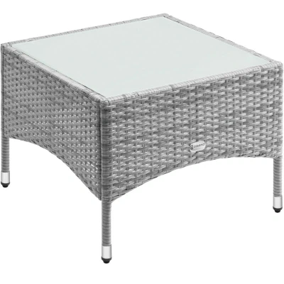 General description These appealing poly rattan side tables create a cosy atmosphere for both indoor and outdoor areas, adding a unique flair to your living environment. Technical specifications Material: UV-resistant poly rattan Frame: Galvanised, powder coated steel Glass tabletop: 5mm thick safety glass Dimensions: 58 x 58 x 42 cm (22.8 x 22.8 x 16.5 in) or 50 x 50 x 45 cm (19.7 x 19.7 x 17.7 in) Load capacity: 80 kg (176.4 lbs, 12.6 stone) Compatibility and accessories Height-adjustable feet Suction pads to prevent the glass plate from sliding Installation Straightforward and fast assembly Includes assembly material and instructions