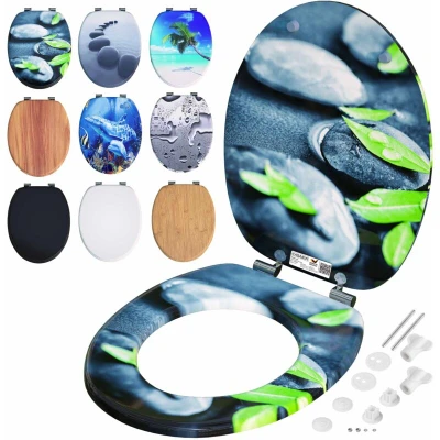 CASARIA® Stone and Leaf Design Double Soft Close Toilet Seat MDF Wood Core Hygienic Stainless Steel Hinges 175kg Capacity Wooden Bathroom Standard D Shape Slow Top Lid Seats