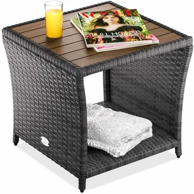 ManoManoGeneral description The CASARIA® Weatherproof Polyrattan Garden Side Table combines modern design with functionality. Made of durable polyrattan and featuring a solid acacia wood tabletop, this stylish and robust side table is perfect for both indoor and outdoor use. With compact dimensions of 45x45x40 cm and an additional storage area, it can be easily integrated with other furniture. Technical specifications Dimensions: 45x45x40 cm Wicker material: polyethylene (PE) Frame material: powder-coated steel Tabletop material: acacia wood Tabletop thickness: 12 mm Load capacity: 80 kg Weight: 13.5 kg Other information Weatherproof and UV-resistant Easy to clean Integrated leveling screws for stability on uneven floors Available in four colors: black, brown, grey, and cream Simple and quick assembly Easy to transport