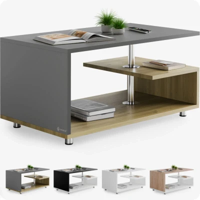 General description The CASARIA® Wood Modern Coffee Table features a minimalist design that adds elegance to any living room. With its open design and puristic lines, this modern Orlando coffee table serves as a highlight in your space. It offers generous storage for books, snacks, and home accessories across its three tiers, while the stainless steel rod connecting the table tops creates an elegant, floating impression. Technical specifications Dimensions: 95x55x50 cm Material: 15 mm chipboard with melamine resin coating, stainless steel Maximum load: 50 kg Available colors: White, White & Oak, Black & White, Wood-Grey Installation Includes assembly instructions for quick and easy setup All assembly materials are provided Usage Easy to clean with a damp cloth due to scratch-resistant and water-repellent coating Height-adjustable feet with rubberized floor protectors for stability and floor protection