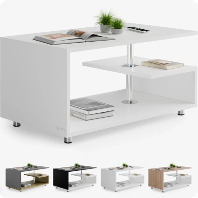 General description The CASARIA® Wood Modern Coffee Table features a minimalist design that adds elegance to any living room. With its dimensions of 95x55x50 cm, this modern Orlando coffee table is available in various colors, allowing it to complement any furnishing style. Its open design and puristic lines make it a standout piece, while a stainless steel rod connects the table tops, creating an elegant, floating impression. The table offers generous storage space for books, snacks, and home accessories across its multiple shelves, with a maximum load capacity of 50 kg. Technical specifications Size (LxWxH): 95x55x50 cm Material: 15 mm chipboard with melamine resin coating, stainless steel Maximum load: 50 kg Available colors: White, White & Oak, Black & White, Grey & Oak Installation Assembly is quick and easy with the included assembly instructions and materials. Usage The table tops feature a scratch-resistant and water-repellent coating, making them easy to clean with a damp