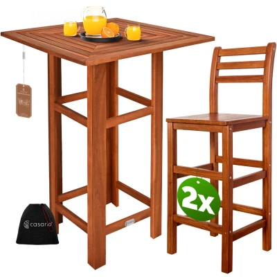 INCL. STOOL WITH BACKREST: The solid bar table with stool from CASARIA impresses with its rustic design and natural wood grain. The set not only looks great on the patio, balcony or in the garden, but can also be used indoors in the kitchen or dining room. WEATHERPROOF: Acacia wood is particularly easy to clean and weatherproof, ideal for outdoor use. Simply clean the high table and chairs with a damp cloth. To maintain the rich colour and durability, we recommend using a special oil for garden furniture. Assembly is child's play. HIGH QUALITY WOOD: The furniture set, made of high-quality hardwood, impresses with its excellent quality and workmanship. The special 4-leg construction makes the bar table and bar stools stable, robust and durable. The bar stools can hold up to 150kg. COMFORT: Thanks to the ergonomic backrests, a seat height of 75 cm, comfortable footrests and a table height of 110 cm, the garden bar offers you outstanding comfort, even when sitting for long periods. A garden furniture set for 2 people that invites you to linger. LOTS OF SPACE: The 75 x 75 cm table top offers you and your guests plenty of space for eating and drinking all around. So you can enjoy the next party at your bar table with stools and are well prepared for the party or cosy dinner.