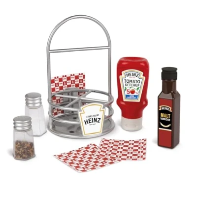 JUST LIKE THE REAL THING: With their own miniature versions of household favourites — right down to the super squeezy ketchup bottle and vinegar that makes a fun noise when shaken — your little chef can navigate the kitchen just like grown-ups. ENDLESS PLAYTIME POSSIBILITIES: Bring a dollop and a dash of creativity to your child’s kitchen playtime, where every pretend meal is a delicious adventure. EASY-TO-GRIP BOTTLE DESIGN: Perfect for little hands to hold and squeeze, encouraging fine motor skills and hand-eye coordination. INCLUDES: Heinz caddy containing: Heinz Tomato Ketchup, Heinz Malt Vinegar, salt shaker, pepper shaker, and Heinz napkins. SUITABLE FOR AGES 3+: Warning: not suitable for children under the age of three years due to small parts. No batteries required., Manufacturer: Casdon, Ltd.