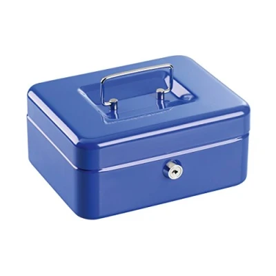 Lockable cash box with 2 keys and handle for easy opening - suitable for sorting cash and valuables, e.g. e.g. jewellery, papers, etc. With practical insert for easy, clear storage of coins - coins of different sizes can be stored separately and within easy reach Made of lacquered steel, assorted colours: blue, silver, with plastic insert, colour: black - subtle, plain design Rectangular shape with rounded edges - flat for easy storage in drawer, shelf or safe - also ideal for organising and changing money at the flea market etc. Dimensions: approx. 15 x 8 x 12 cm. Weight: approx. 643 g