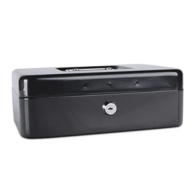 large cash box made of durable metal;; size: 250x180x90mm varnished and coated with special protective layer; equipped with a coin tray;; rounded edges; a handle for easy carrying;; colour: black lockable, 2 keys included;