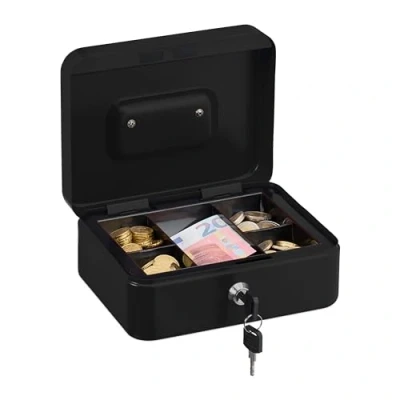 AmazonSecure: Lockable cash box in black with lock and 2 keys - Secure cash storage Organised: Money box with removable insert with 5 compartments - simply organise notes and coins Versatile: Cash box for cash - For clubs, flea markets, fairs and other events Sturdy: Cash box made of robust iron with powder coating - Dimensions HxWxD: approx. 8.5 x 20 x 17 cm Portable: Handy cash box with practical carrying handle for easy transport - ideal for taking along