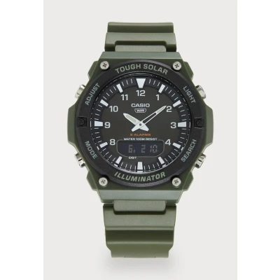 This iconic CASIO watch runs on reliable Tough Solar power and comes equipped with dual countdown timers a stopwatch 5 daily alarms and a world time function Built for durability it features a rugged resin case and is water resistant up to 100 meters.