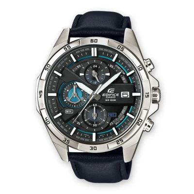 This Casio Edifice Chronograph Watch for Men is the perfect timepiece to wear or to gift. It's Silver 49 mm Round case combined with the comfortable Black Leather watch band will ensure you enjoy this stunning timepiece without any compromise. Operated by a high quality Quartz movement and water resistant to 10 bars, your watch will keep ticking. Stylish- Sporty and a modern design, very suitable for Men -The watch has a calendar function: Date, Stopwatch, 24 hour display, Luminous Hand High quality 22 cm length and 21 mm width Black Leather strap with a Buckle Case diameter: 49 mm,case thickness: 13 mm, case colour: Silver and dial colour: Black