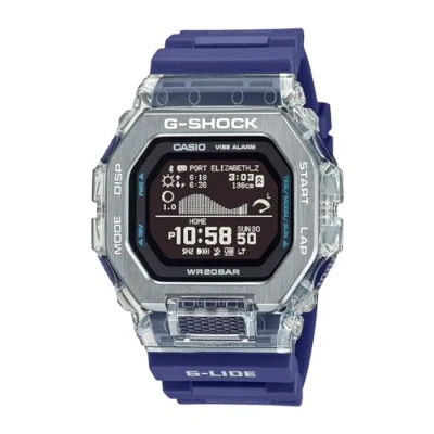 Get the toughness surfers need and the vibrant summer style they love with the G-LIDE G-SHOCK. This Digital watch features a calendar function: Day-Date and is equipped with Bluetooth , Tide tracker , Stop Watch , Alarm and a Light High quality Blue Plastic strap, measuring 21 cm in length and 24 mm in width, with a Buckle Case measurement: 44 X 46 mm,case thickness: 14 mm, case colour: Transparent and dial colour: Beige Water resistant: 20 bars-Weight: 65 g The watch is delivered in an original gift box and has a warranty of 2 years