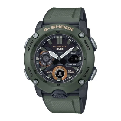 Built for a high-impact life, this Casio watch is the ultimate tough companion. This watch is crafted with a khaki green resin strap and features a black round dial with silver hands an alarm and two digital subdials. An everyday staple with great functionality, this Casio watch is life-proof. Khaki green resin band Digital and analogue dial Shock resistant Carbon core guard structure Water resistant to 200 metres Light up mode Daily alarm 5 daily alarms Hourly time signal 12/24 hour format Hand shift feature Stopwatch function Timer function Dimensions: 51.2 × 47 × 14.1 mm